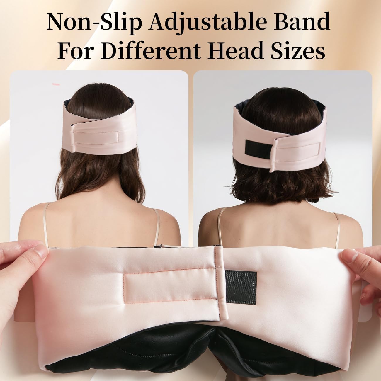 - FULL-FACE HUGGING SLEEP MASK SUITABLE FOR SIDE SLEEPERS: The silk sleep mask's cushion belt wrapping in all directions evenly distributes pressure from the ears, nose, and hair, making our sleep masks for women a great choice for side sleeper. When you accidentally fall asleep on your side, this silk eye mask won't make you feel your ears being squeezed.