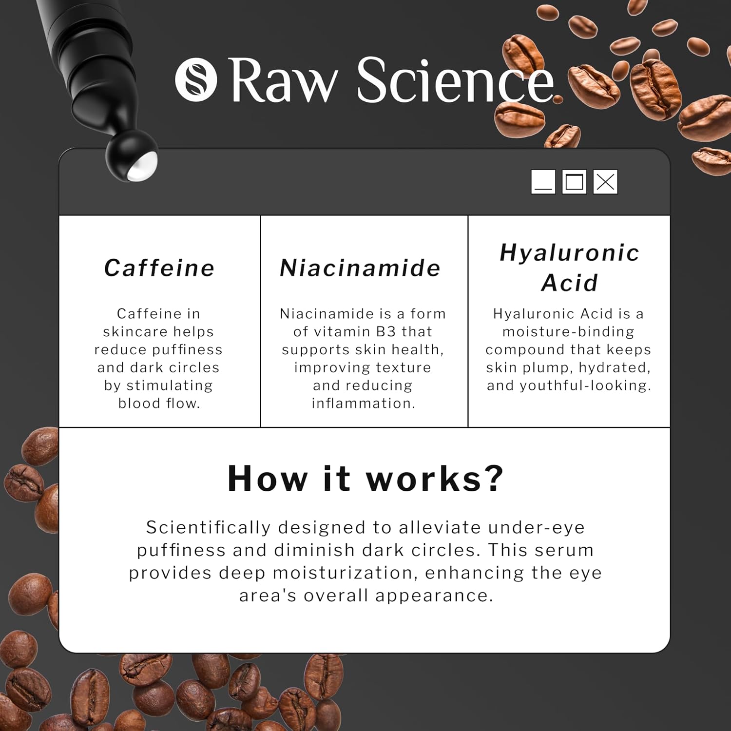 - 【BANISH DARK CIRCLE】- Multi-component niacinamide serum for the face is your ultimate weapon against dark circles under eye treatment men's and women's looks. The under eye roller serum infused with caffeine cream magic and retinol eye cream's prowess for a transformative dark eyes circle treatment.