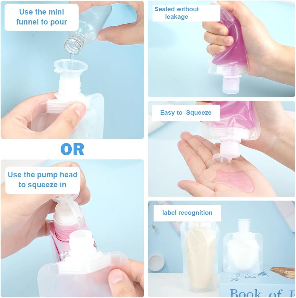- 【Easy To Use】Our travel size stand up pouch for lotion shampoo are designed with a large opening, and with our complimentary mini funnel, you can fill them with shampoo, body wash, lotion, etc., which is much more convenient and quicker. to use, simply unscrew the cap and gently squeeze, the liquid will flow out very smoothly, easily applicable to a variety of liquids. you can also pull off the bottom for easy filling and standing up.