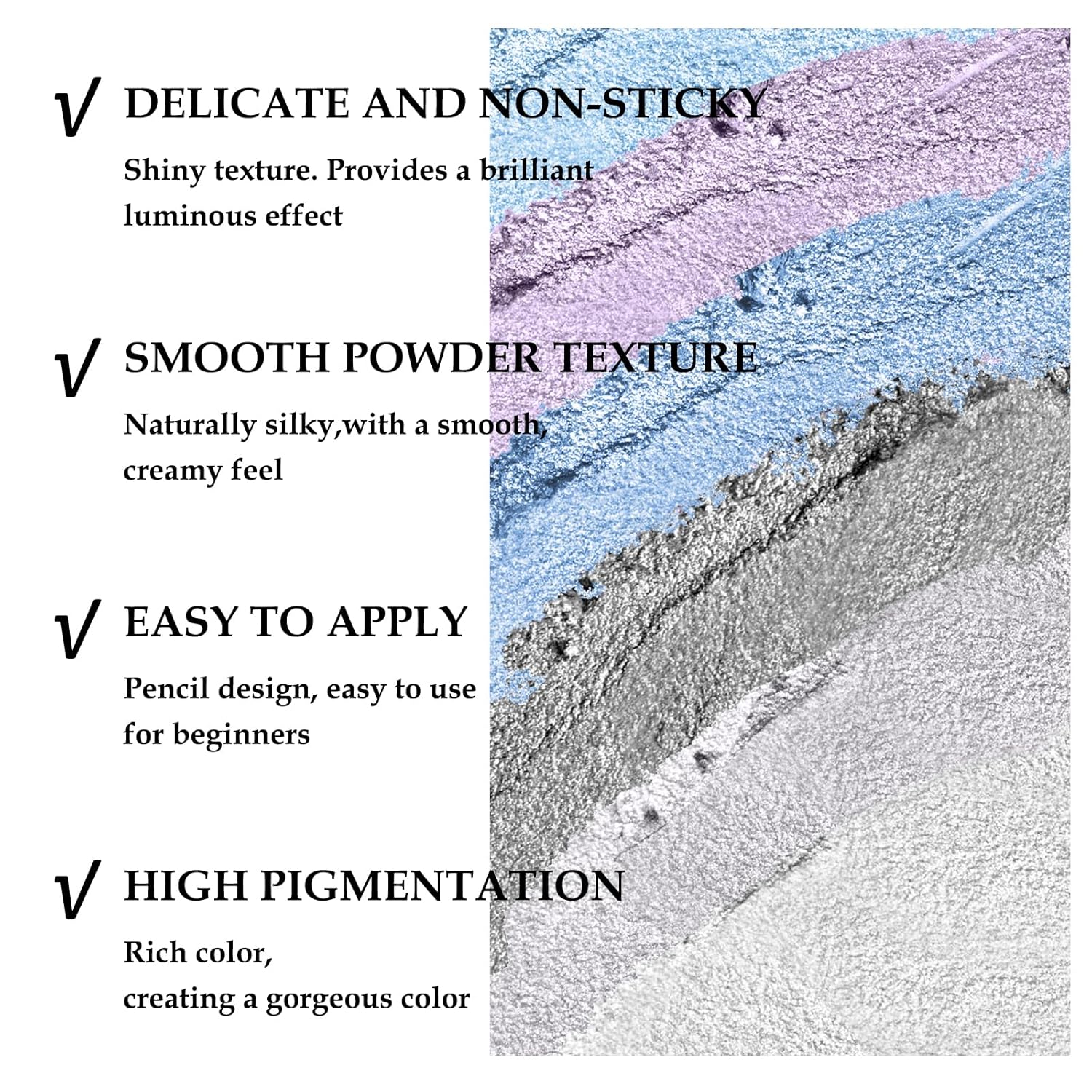 - Eye Highlighter Stick: Glitter Eyeshadow Pen has a shimmer color. You can easily apply a gradient look with it. Multiple colors for you to choose from to create different eye makeup.