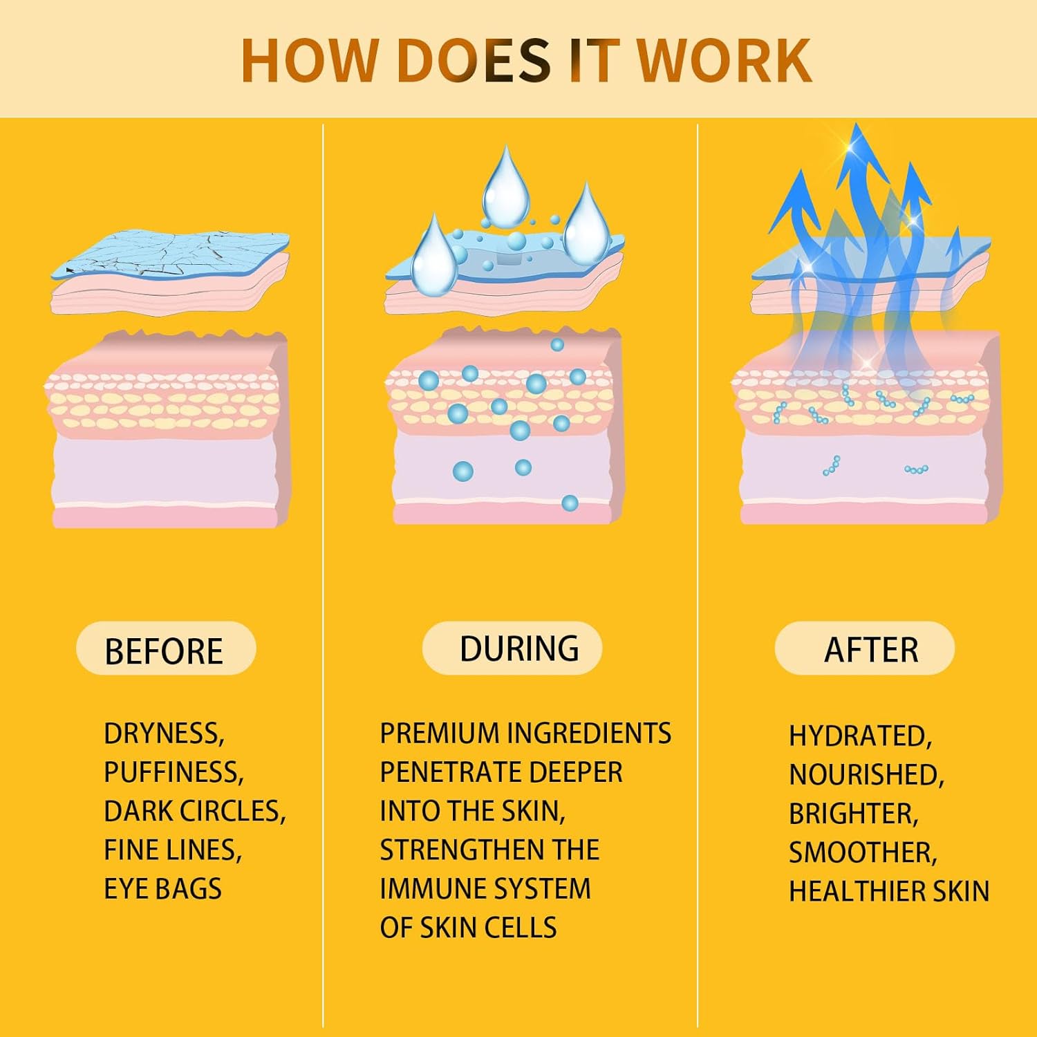 - Cutting-Edge Design and Formulation: Our gold under eye mask patches are ergonomically designed to adhere perfectly to your skin. The premium ingredients are applied to the skin's surface, providing excellent moisturizing effects. These patches contain natural moisturizing factors, primarily suitable for addressing dry and peeling skin symptoms. They also enhance skin tightness, leading to reduced and diluted pores, as well as promoting skin metabolism.