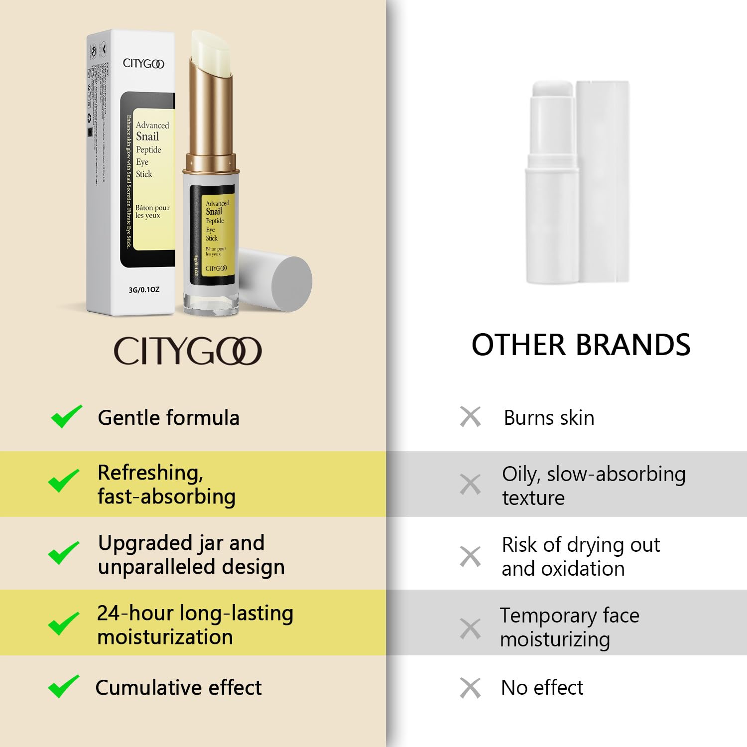 - SIMPLE APPLICATION: Post-cleansing, glide our Snail Peptide Eye Stick gently around your entire eye area using small, circular motions. Begin with once every 2-3 days initially to let your skin adjust, then progress to applying once daily at night or twice daily (morning and evening) after one week.