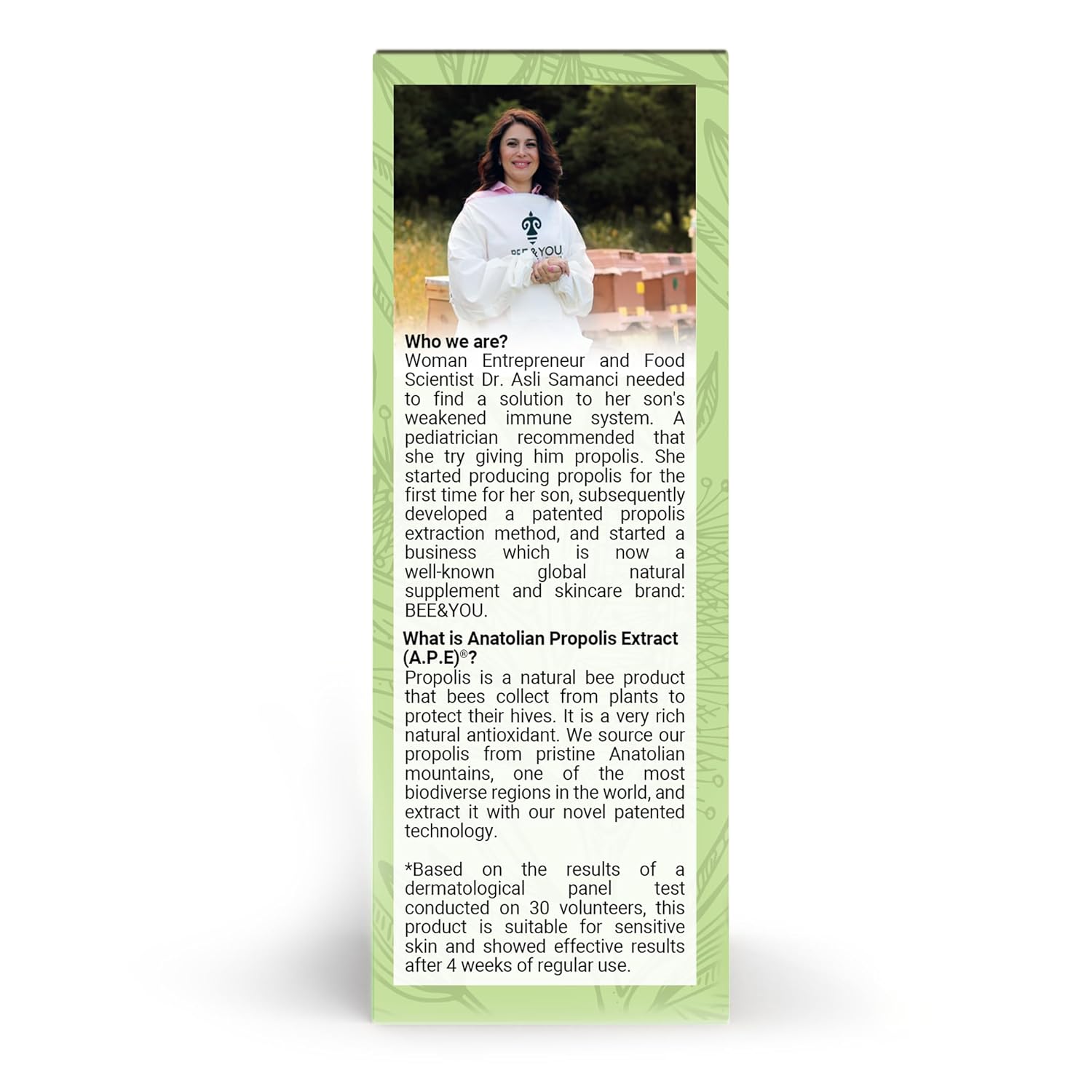- Anatolian Propolis Extract: Propolis is a natural product made by bees and is abundant in natural antioxidants. We obtain our propolis from the pristine Anatolian mountains, which are home to 12,000 distinct plant species, making it one of the most biodiverse regions in the World. We extract the propolis using our unique patented technology.