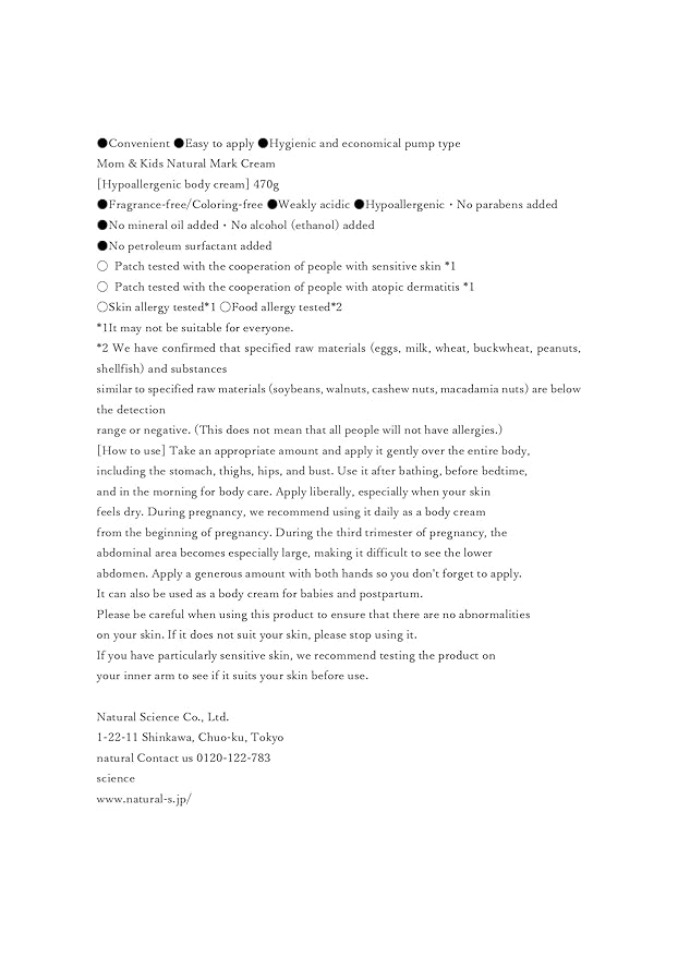 - 【Moisturizing for Dry Skin】 A body cream born from the collaboration of midwives and experienced moms. It's a fragrance-free, color-free, and gentle formula, perfect for Japanese expectant mothers. Its ease of use without the need for massage is one of its appealing features. With its high moisturizing power, it's also great as a body cream for combating dryness.