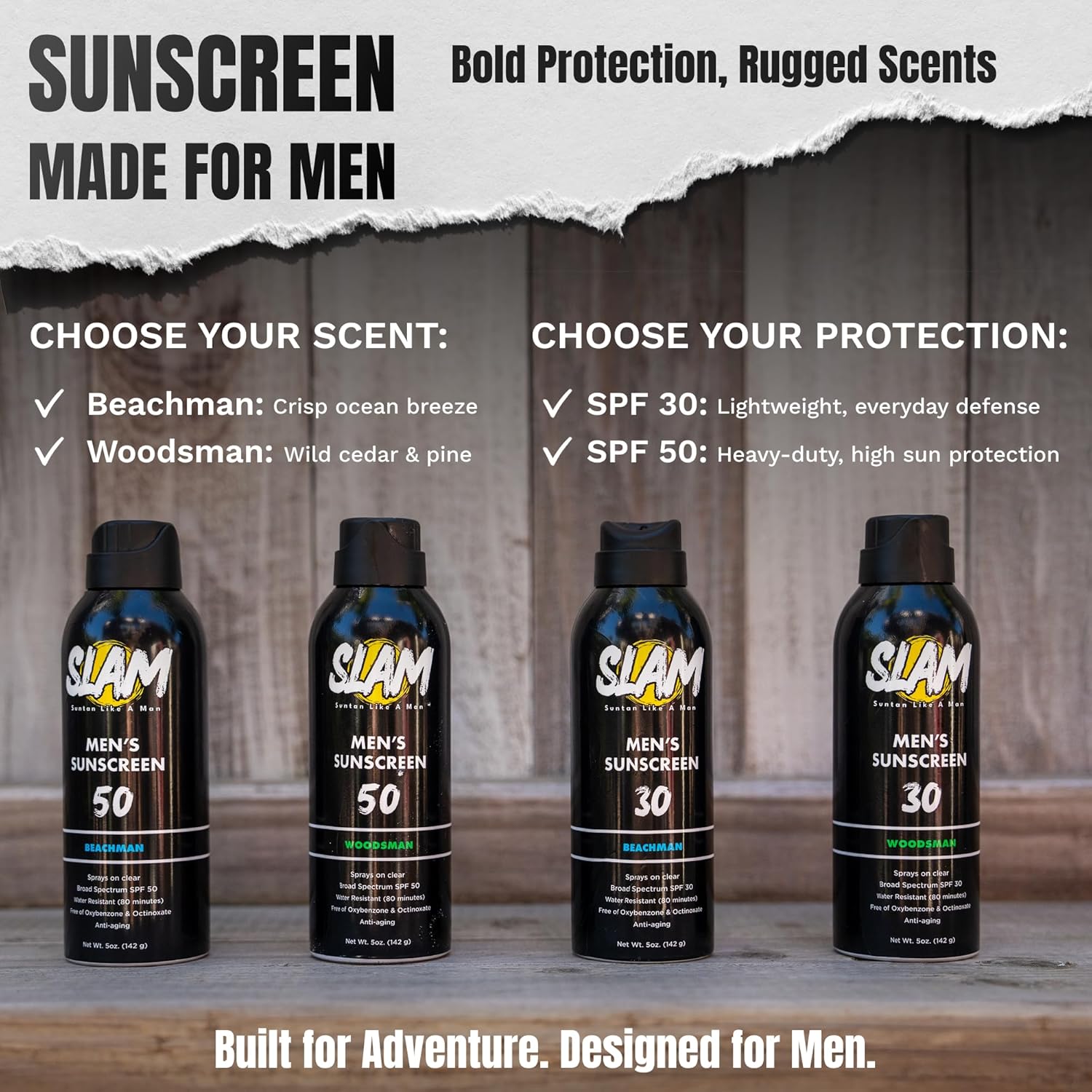 - Manly Teakwood Scented Sunscreen Spray: Embrace the rugged aroma of teakwood with this men’s sunscreen spray. Slam Lotion WoodsMan SPF 50 sun screen spray keeps you protected and smelling great on every outdoor adventure. The perfect size sunscreen spray.