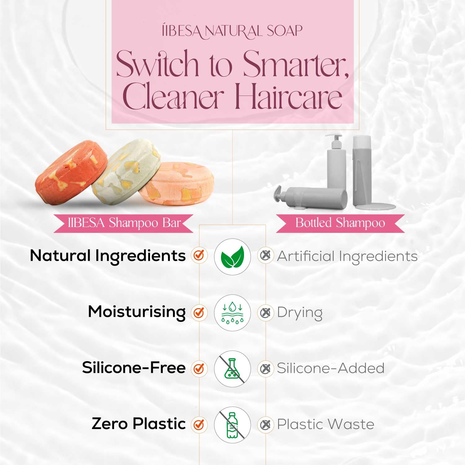 - Pure, Safe & Gentle Shampoo Bar Soap: Free from sulfates, parabens, artificial fragrances, and dyes, the IIBESA Natural Soap moisturizing shampoo bar is ideal for sensitive hair and scalps. Whether you are searching for a cleansing oily hair shampoo, dry hair shampoo, or curly hair shampoo, our natural hair shampoo bar will provide a soothing cleanse without harsh chemicals.