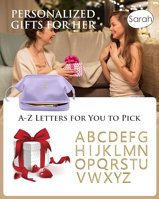 Initial Makeup Bags, Friend Gifts, Personalized Double Layer Cosmetic Bag with Makeup Brush Organizer, Waterproof, Large Capacity PU Leather Travel Toiletry Bag, Birthday Gifts for Girls
