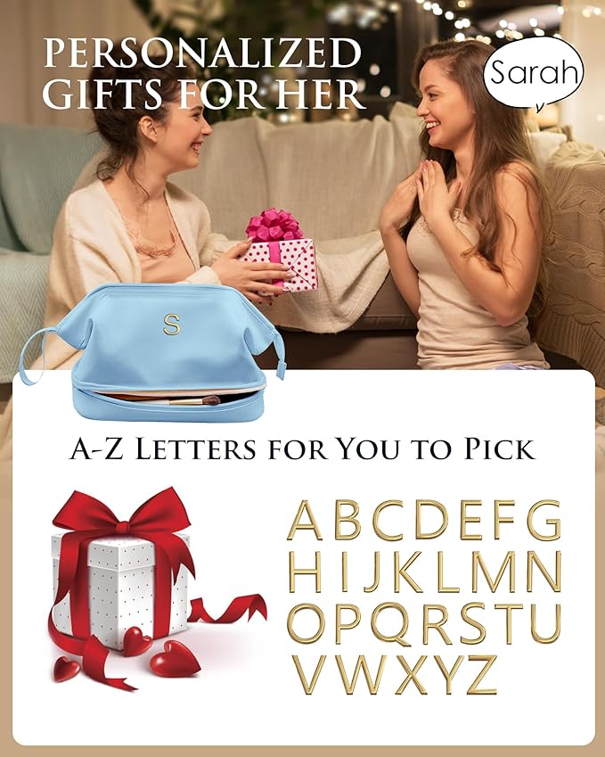 Birthday Gifts for Girls, Initial Large Makeup Bag, Personalized Double Layer Cosmetic Bag with Makeup Brush Organizer, Large Capacity PU Leather Travel Toiletry Bag Travel Stuff for Girls