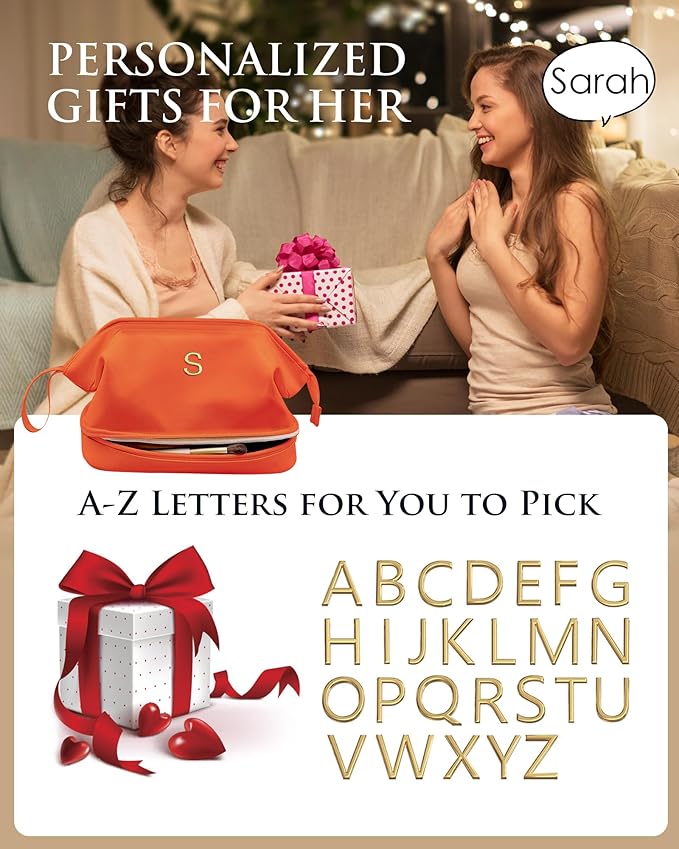 Bridesmaid Gifts for Women, Initial Makeup Bag, Personalized Double Layer Cosmetic Bag with Makeup Brush Organizer, Large Capacity PU Leather Travel Toiletry Bag, Personalized Teacher Gifts