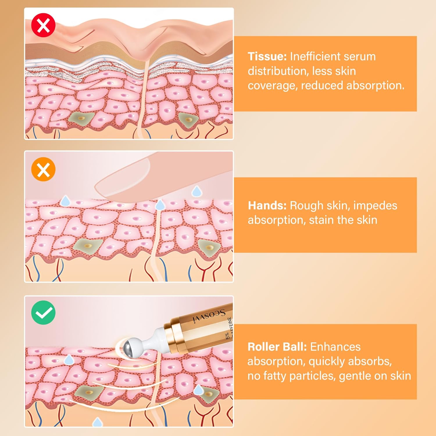 - Smooth and Lightweight Formula: Our caffeine eye serum has a silky, lightweight texture. It absorbs quickly and leaves your skin smooth without feeling greasy. You can easily layer it with other moisturizers and serums, making it perfect for dark circles under the eyes.