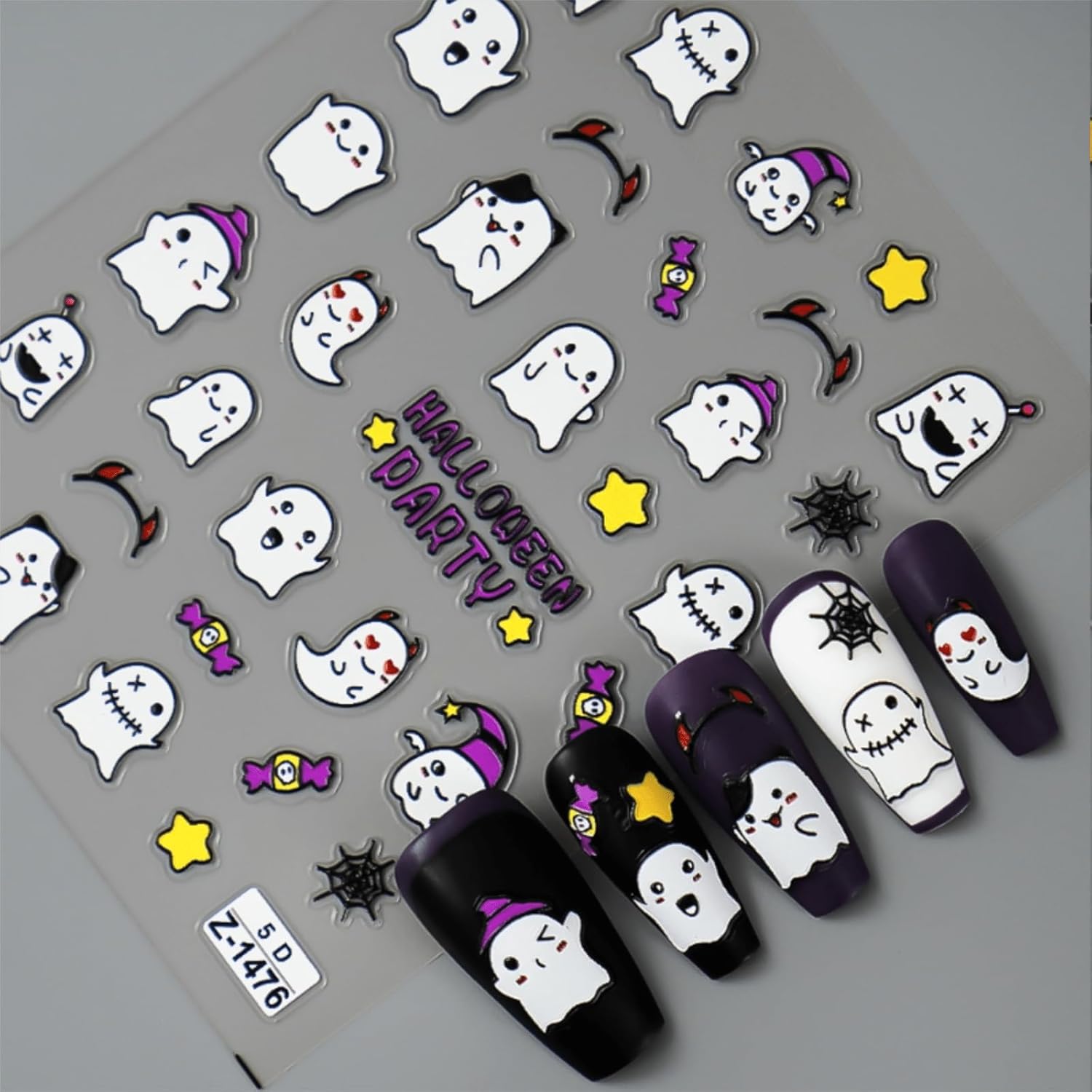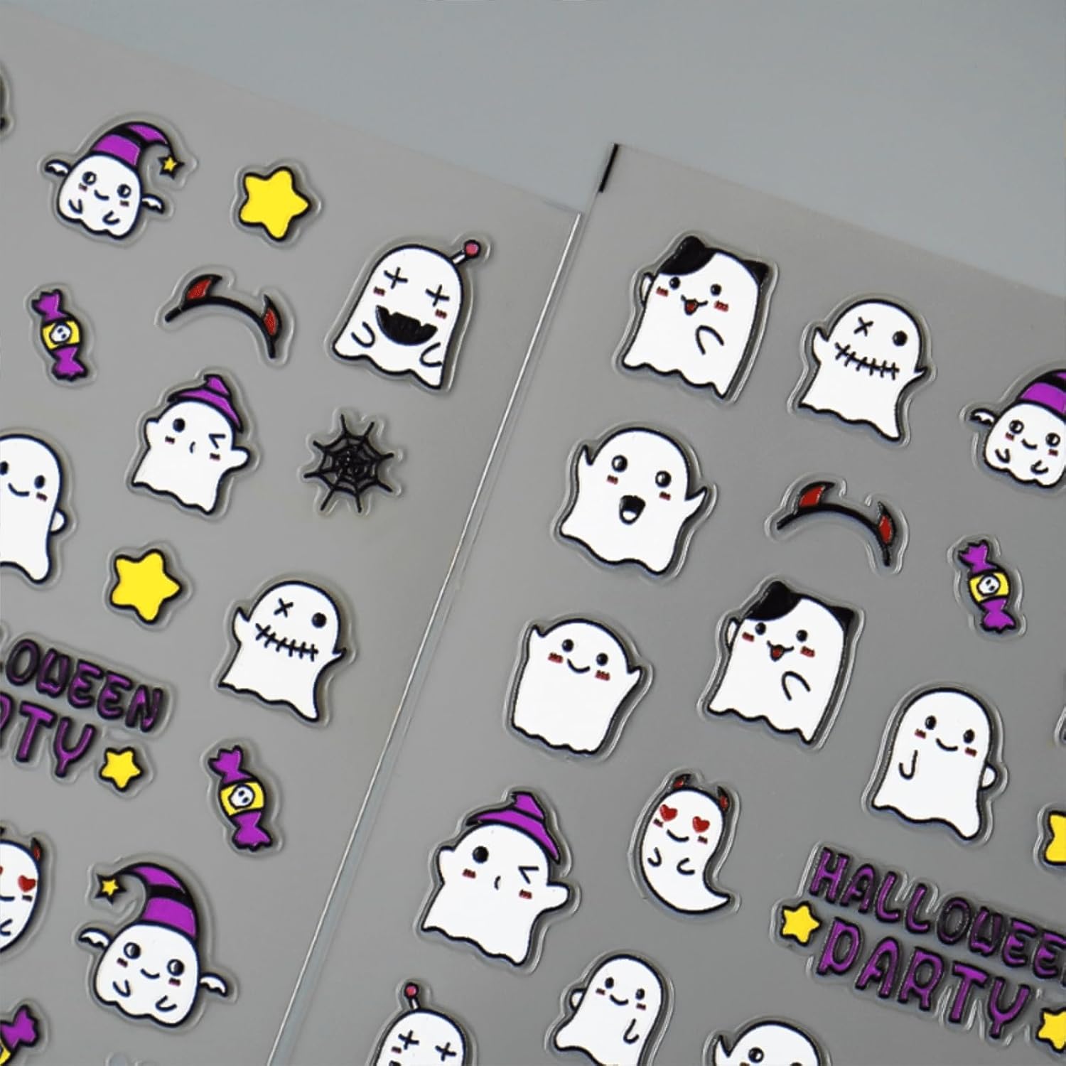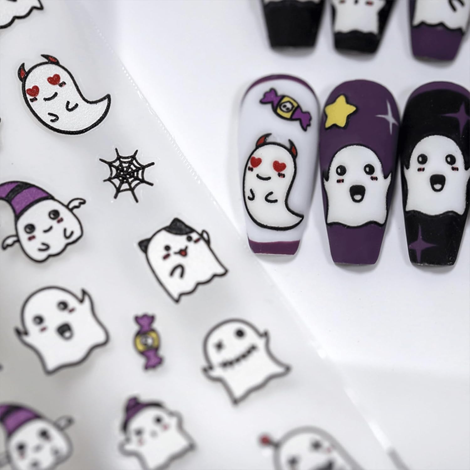 - ăHalloween Nail art StickersăYou will get 2 sheets Halloween nail stickers in one set of different cute ghost nail stickers for nail art, satisfy all your love for beautiful nails, a variety of elements for you to choose from to DIY your own nail art design.