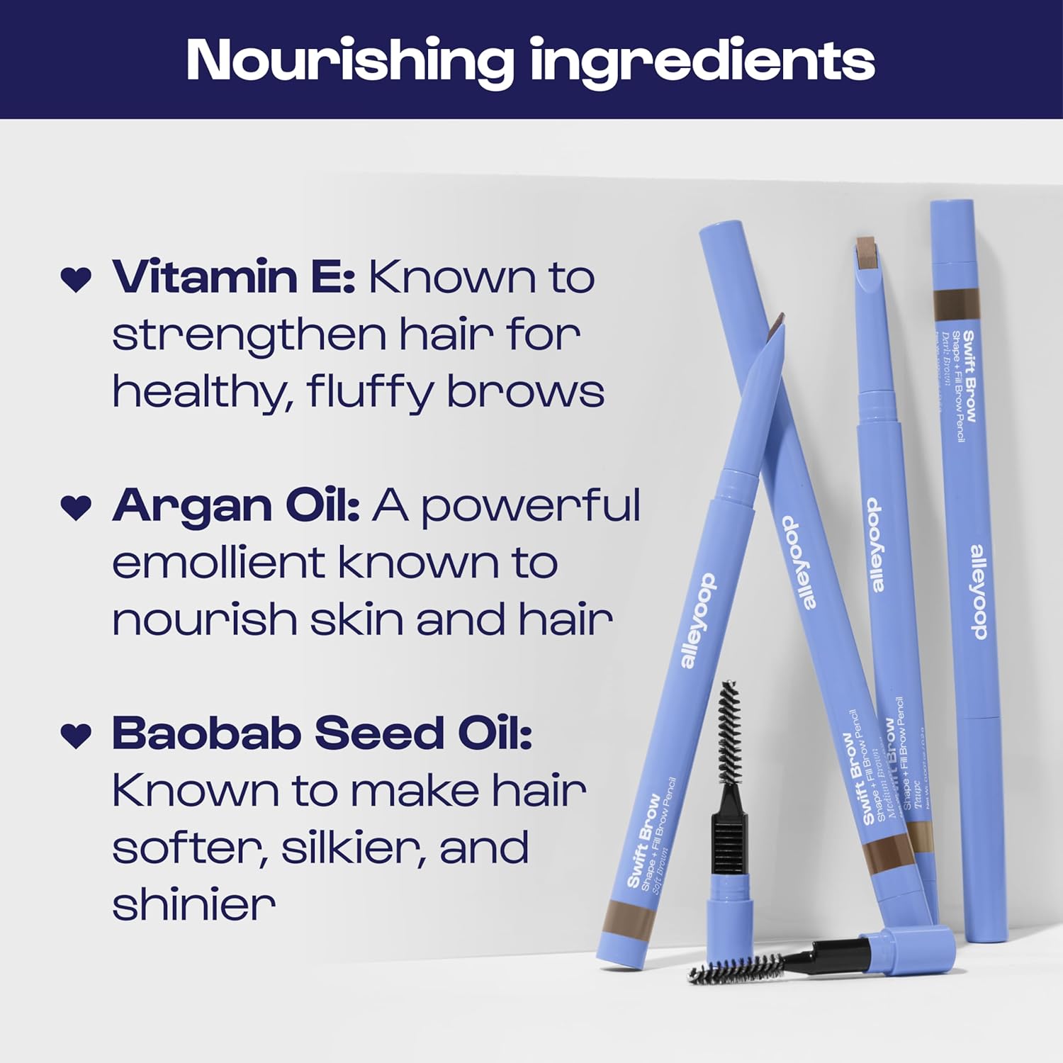 - NOURISHING CARE: Love your brows with this formula! Infused with Vitamin E, Argan Oil, and Baobab Seed Oil, it conditions and blends. Whether you use an eyebrow pen, eyebrow pencil, or brow liner, this eyebrow liner and eye brow pencil keep brows flawless!