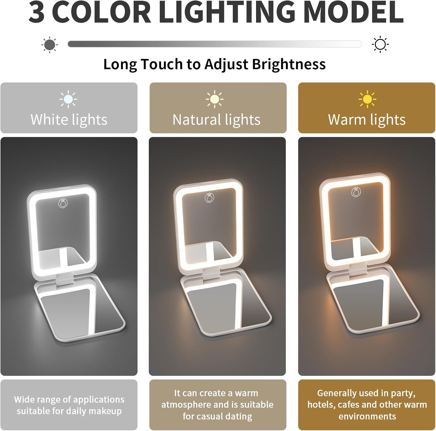 - 【Soft Light】Long press to adjust the brightness, daylight is excellent, providing a clear view and true color details for makeup