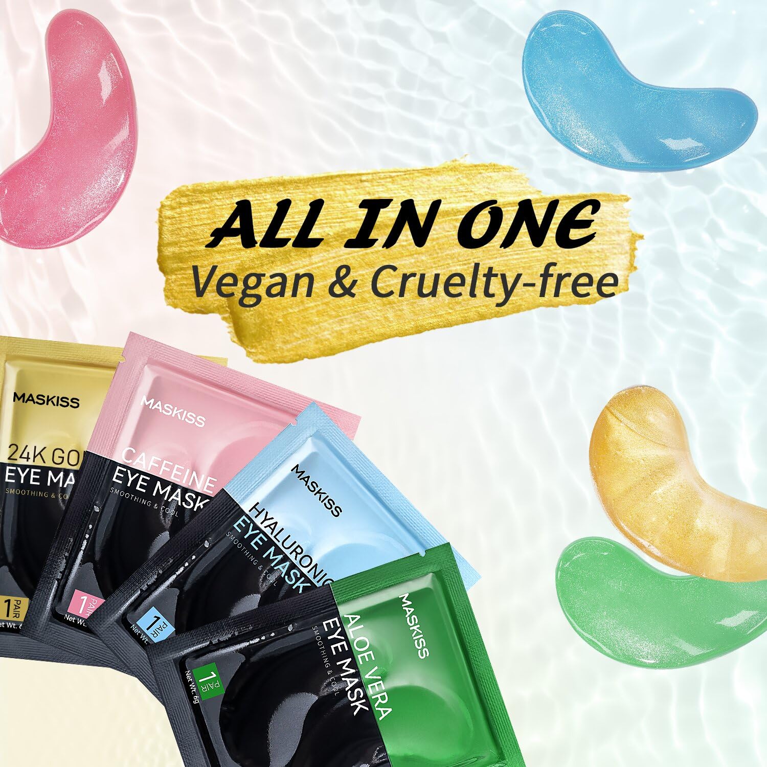 - Comprehensive Eye Care Treatment: The Maskiss set includes 4 colors, 30 pairs of under-eye patches. 24k Gold eye mask helps to smooth the skin, reduce fine lines and wrinkles. Caffeine eye patches help promotes eye metabolism and circulation, and reduces eye bags and puffy eyes. Hyaluronic acid eye masks help to fade dry lines and wrinkles, and locks in moisture and nutrition. Aloe vera eye patch helps to reduce pigmentation, repair the healing barrier, and gently moisturize the skin. Add these to your daily self-care routine for a visibly younger, well-rested appearance.