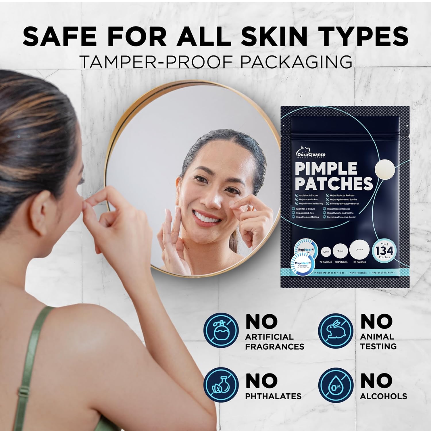 - Powerful Acne-Fighting Formula: Our acne patches go beyond simple coverage. Powered by Dura Cleanse RapiHeal+ Complex, they are infused with Niacinamide, Tea Tree Oil, Salicylic Acid, Hyaluronic Acid, and Centella Asiatica to penetrate deep within pores, absorb impurities, and calm irritation. This advanced formula promotes faster healing while preventing future breakouts without over-drying or irritating sensitive skin.