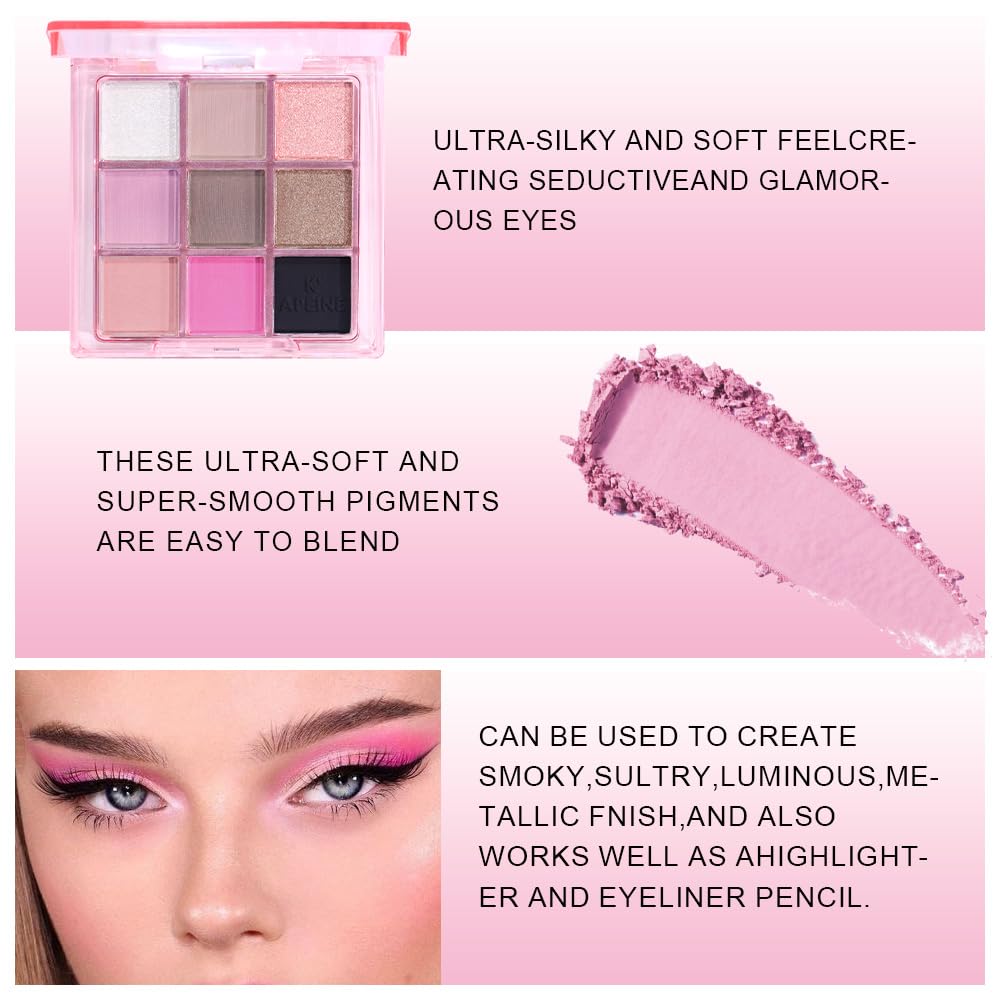 - 1. π¨ 9 Stunning Eyeshadow Colors for Every Look Discover a versatile eyeshadow palette that includes White glitter, Nude matte, Pink glitter, Light purple matte, Brown matte, Gold glitter, Peach matte, Bright pink matte, and Black matte. These rich shades are perfect for creating everything from natural daytime eyeshadow to bold, glamorous looks.
