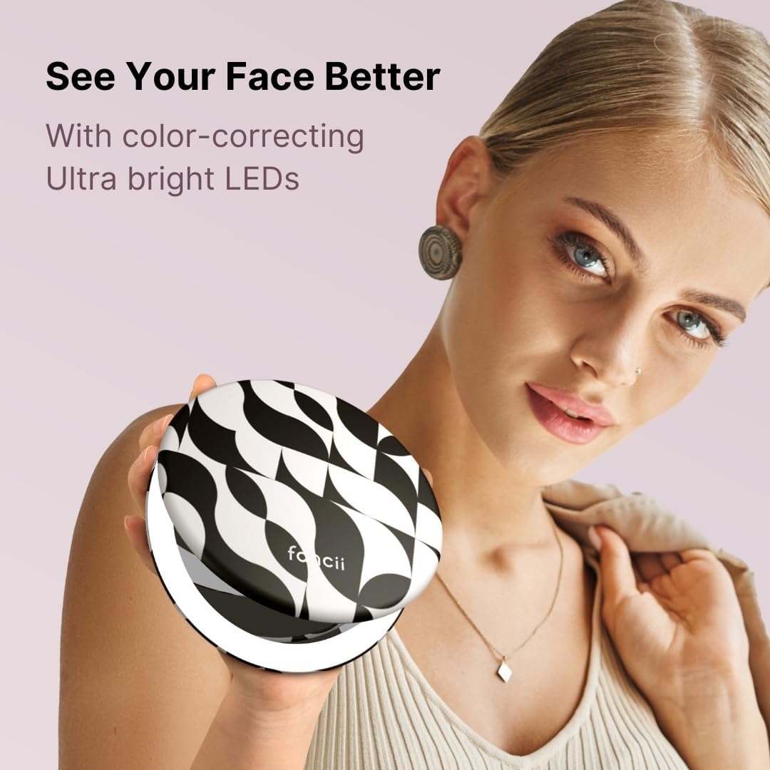 Fancii Taylor Compact Travel Makeup Mirror with Lights, 10x /1x Magnifying, Rechargeable, 3 Light Modes, Dimmable - Small Lighted Handheld Purse Mirror, Double Sided, for Gifts (Mellow Monochrome)