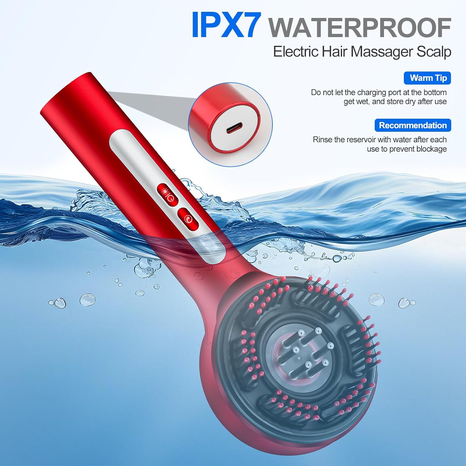 - IPX7 Waterproof Electric Hair Massager Scalp - This hair oil applicator scalp massager brush scalp massage comb is waterproof with a dry and wet dual-use design. The fully sealed structure provides waterproofing at the IPX7 level, allowing for direct rinsing with water after use, ensuring quick and convenient cleaning. Recommendation: Rinse the reservoir with water after each use to prevent blockage. Tip: Do not let the charging port at the bottom get wet, and store dry after use.