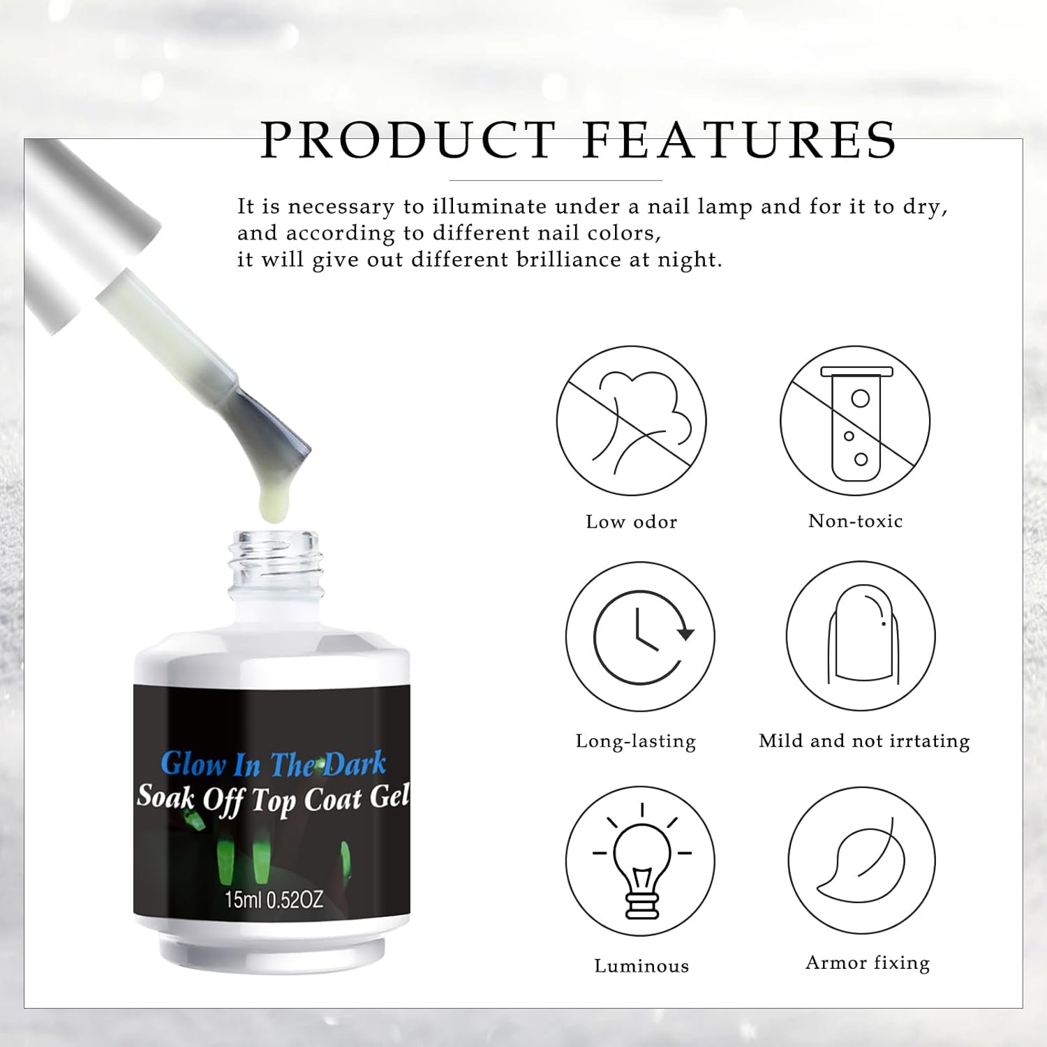Glow In The Dark Nail Gel Top Coat, Transparent Luminous Universal Top Coat for Any Colors DIY Halloween Nail Art, UV LED Needed Long-lasting Nail Gel(15ml/0.52 fl oz)
