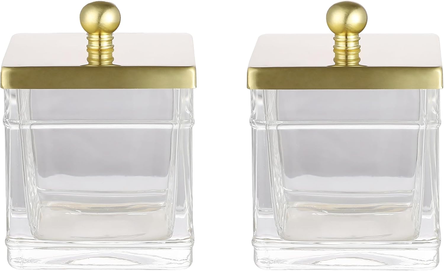 Glass Cotton Jar Holder 2 Pack– Brushed Gold Lid, Elegant Bathroom Storage Canister for Qtips, Cotton Balls, Floss, Makeup Organizer, Vanity & Bathroom Organization